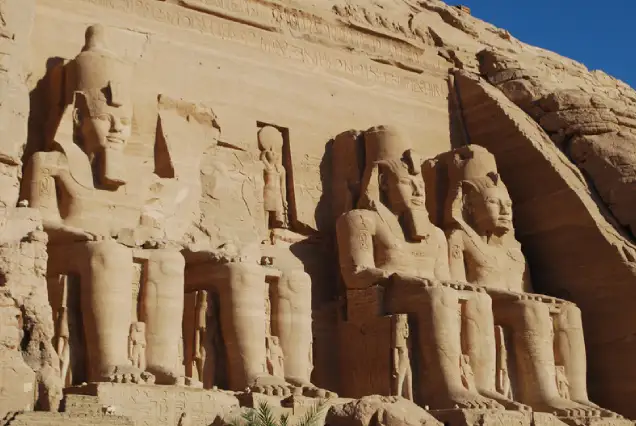 Leaveing Aswan to visit the rock-cut temple of the king Ramesses ll Their huge external rock relief figures have become iconic. His wife Nefertari and children can be seen in smaller figures by his feet,